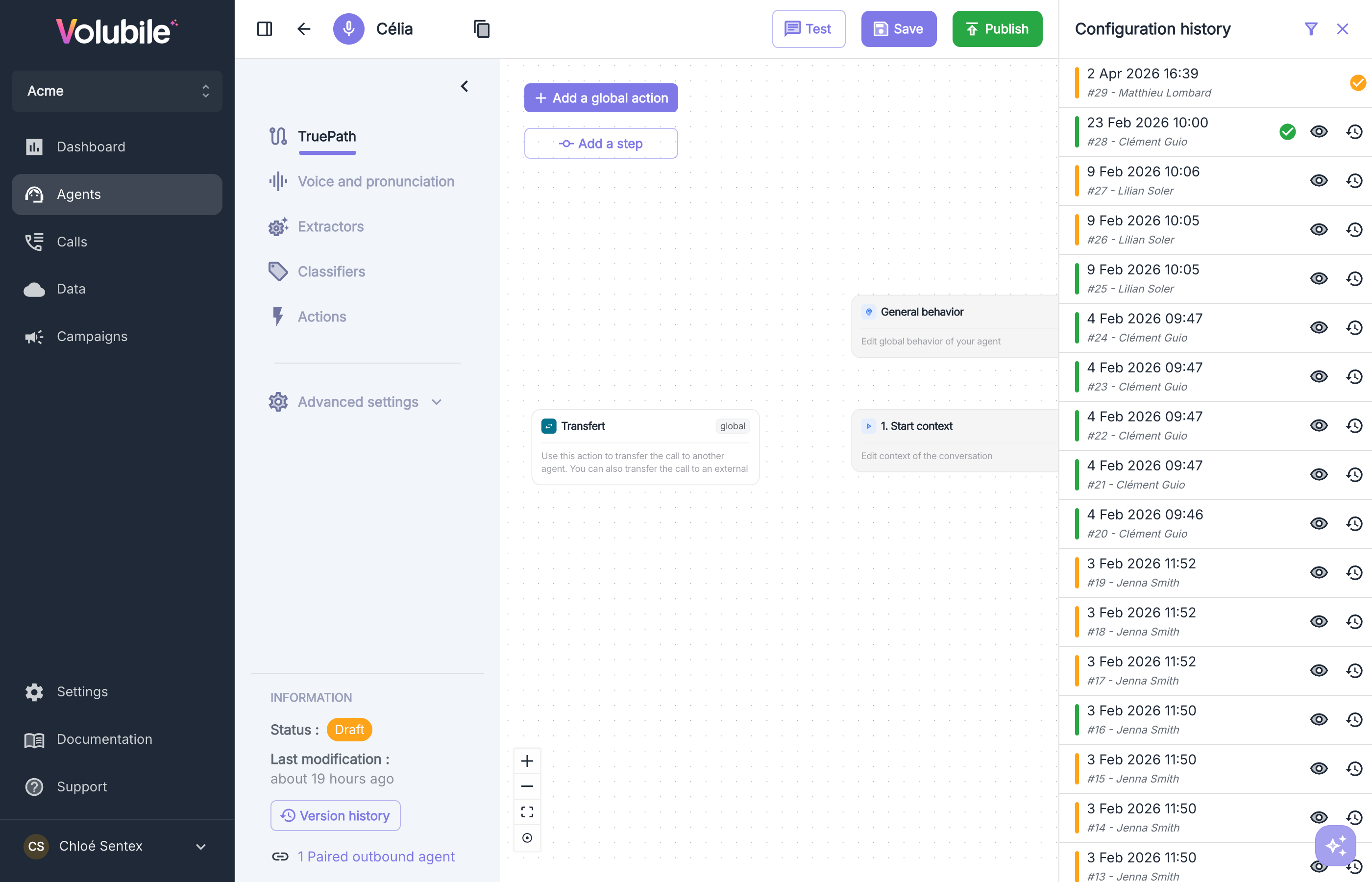 Toute modification d'un agent est horodatée, tracée et associée à son auteur. Restauration en un clic vers n'importe quelle version antérieure.